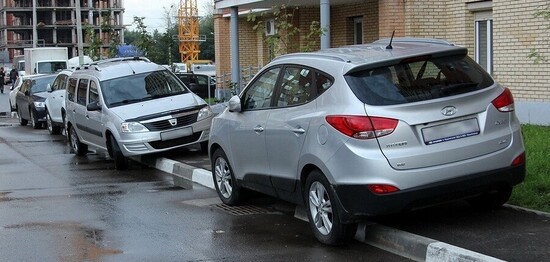 Парковка возле многоквартирного дома на пешеходном тротуаре в Москве. Источник: primgazeta.ru/news/for-travel-on-the-sidewalk-will-be-revoked-for-six-months.