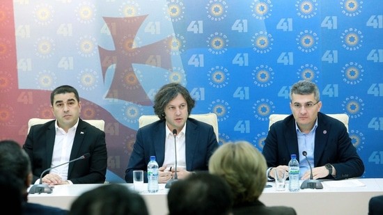 Боевое крыло Грузинской Мечты. Спикер парламента Папуашвили, премьер Кобахидзе, глава фракции Мдинарадзе. Не хватает мэра Тбилиси Каладзе и председателя партии Гарибашвили. Ну и ещё одного человека, которого почти не видно, даже после официального возвращения в политику.