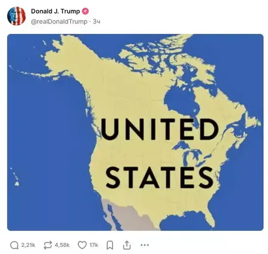 Дональд Трамп опубликовал карту США с присоединенной Канадой. Скриншот из соцсети Truth Social