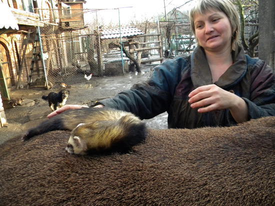 Хорек. Кто-то его в Новочеркасске дома держал, потом надоело, отдали и он попал к нам. Там он у мальчика жил, бегал на воле, а мы его не можем на волю отпустить из-за большого числа живности. Боимся, что с ним что-то случится. Яйца, которые несут курицы, скармливаем хорькам. Яйца перепелок даем обезьянам.