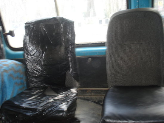 Как видите, водитель маршрутки, курсирующей по славной столице нашей республике, Махачкале, особо не заморачивался по поводу того, чем обить салон: кожей, замшей или брезентом. Пакет "БМВ" за 5 рублев решил все его душевные терзания!