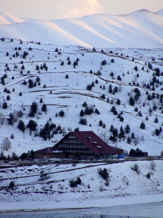 Добирались очень осторожно, был гололед и машину периодически заносило на горном серпантине, добрались затемно и сразу пожалели, что не привезли новогодние игрушки, чтобы украсить одну из ёлок растущих возле озера и не отпраздновали новый год :-)