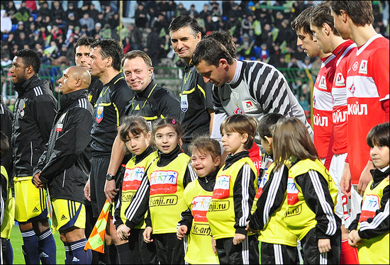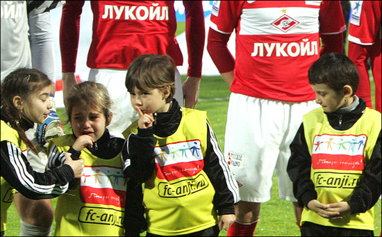 Интересно, чем так напугали спартаковцы бедного ребёнка, что девочка расплакалась прямо на предматчевой церемонии? Может быть, это реакция на жест мальчика справа от неё "а-ля Аршавин", в таком случае в Махачкале подрастает тонкий ценитель футбола. Впрочем, и сам "Спартак" сейчас никаких других эмоций не вызывает. В результате всех этих маленьких трагикомедий, Эйден Макгиди вообще остался без ребёнка.