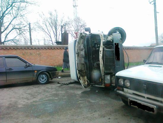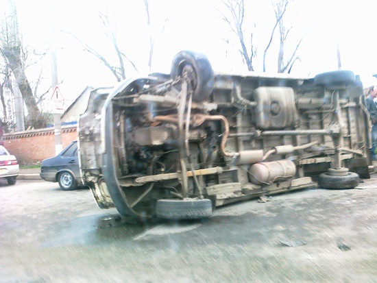 На фото: перевернутый микроавтобус Форд "Транзит" и ВАЗ "2114"