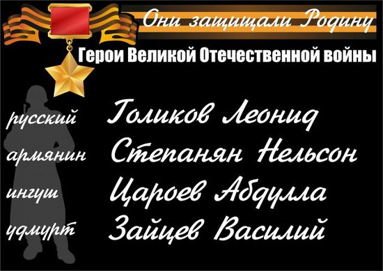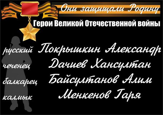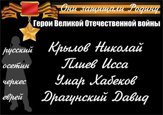 p.s.: прямо в тему. Российский Конгресс народов Кавказа запускает в это воскресенье акцию "они защищали нашу родину". "Несколько тысяч стикеров с именами героев ВОВ разных национальностей на стеклах автомобилей должны напомнить всем, что когда-то, 66 лет назад, не разделяясь ни по каким признакам, русские и якуты, калмыки и чеченцы, карачаевцы и татары и многие-многие другие…одержали победу, одну на всех".Вот некоторые из них.