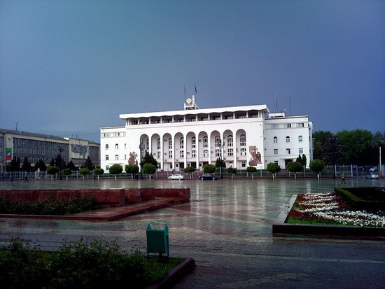 После дождя площадь выглядела прикольно. Одна сторона полностью затянуты сизыми тучами, а в другой солнышко прорвалось и осветило дом правительства. Короче, вотЪ: