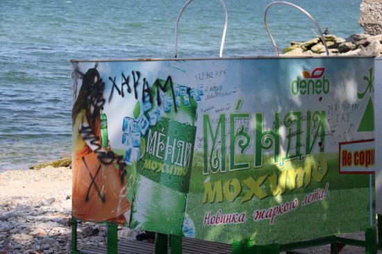 В общем к 15:00 добрались до городского пляжа, прошлись, посмотрели все и сделали кучу замечаний которые необходимо устранить до открытия сезона. Я не был на этом пляже наверное уж лет 5 если не больше. Берег изменился за годы до неузнаваемости. Больше всего конечно удивило уже наверное ставшей привычной для нашего города явление. Рекламная наклейка на раздевалках была кем то тщательно замазано краской и корявым почерком написано ХАРАМ. Что там харамного так и не смог понять, но тому кто это писал, наверное виднее. Как у Высоцкого в песне – жираф он большой ему видней.