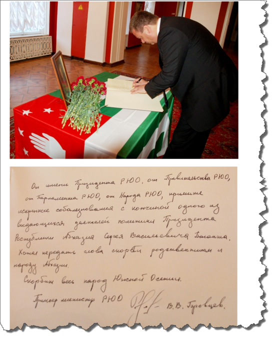 3. Собалезнования примьер министра от имени Призидента - в блоге Лизы Валиевой из Северной Осетии письменные соболезнования председателя правительства Южной Осетии абхазскому народу.