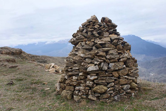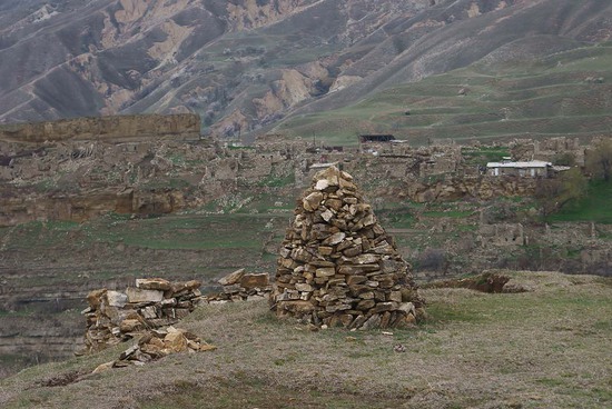 На горе напротив села Тандо есть такое вот каменное сооружение. Я точно не знаю, что это именно. Но выкладывали его скорее всего военные, в период второй компании. Может быть это памятник, а может что-то вроде пригопункта, ориентира. Такие же две каменных кладки есть на горе Алилен (в народе Ослиное ухо), стоят рядом. Про них так и говорят - памятники, погибшим разведчикам и десантникам, которые штурмовали высоту и тела которых боевики сбрасывали с высоты. Но точной истории появления этих каменных пирамид я не знаю.