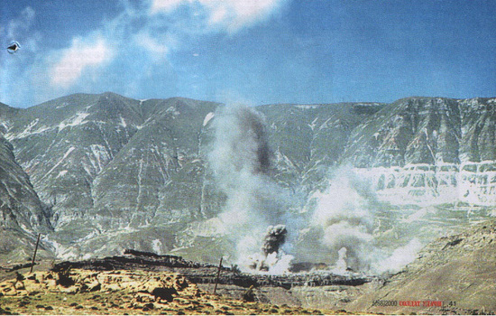 А это фото я нашёл недавно при чтении старых номеров журнала "Солдат удачи". В 5(68) номере за 2000 год есть статья Сергея Козлова "Дагестан: репетиция или провокация?" с фотографиями Сергея Сидорова. Эта фотография - одна из них. На ней зафиксирован момент нанесения огня то ли авиации то ли артиллерии по селу Тандо, вид примерно с тех же позиций.