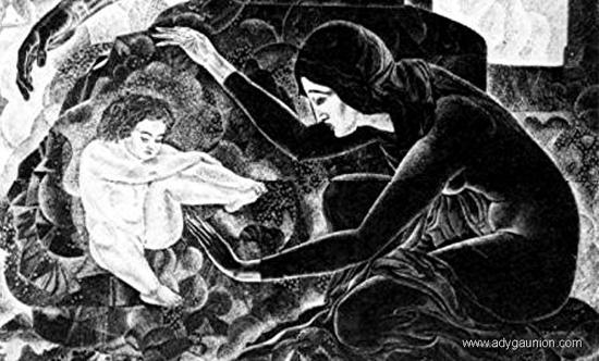 У адыгского художника Феликса Петуваша - это цикл, посвященный нартским сказаниям. Это картина, на которой - знаменитый нартский сюжет рождения у прародительницы нартов Сатэнай мальчика из камня - Саусруко.