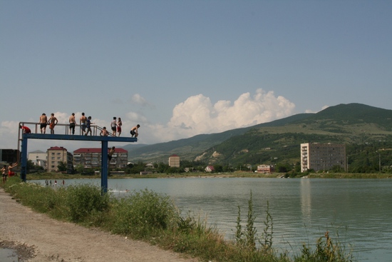 На озеро можно сходить и по поросшей бурьяном наклонной бетонке сбежать в воду, распугивая лягушек. На этой же раскаленной бетонке посидеть обсохнуть. Больше то, присесть, а тем более прилечь, особо не на чем. Хотя при обилии техники можно было, и сообразить искусственные пляж. Песка привести, навесы поставить. Устали уже об этом говорить цхинвальцы. Но по моему, мы этого никогда не сделаем. Мы же я ярые противники вообще всего удобного, комфортного, красивого, гармоничного. Была бы вода, камера от КАМАЗа и бывший саперный понтон! А, да еще есть вышка для прыжков!