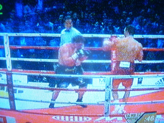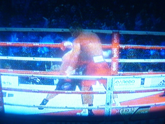 00. 36 - Кличко бьет Поветкина. Третий раунд. Уже есть один нокдаун. Я искренне готовился болеть за российского боксера, русского витязя, Поветкина. Верил, надеялся, что он побьет, надоевшего уже всем, примитивно-прагматичного Кличко. Первый раз в жизни, поставил на него в тотализаторе. Так, что бы поддержать. Но все надежды мои рухнули, когда я увидел, что гимн России, перед боем, поет Кобзон. Априори, не сможет одержать победу, человек, когда «на бой и на подвиги его вдохновил» этот лживый, беспринципный, жуликоватый певун. Вечный конформист, друг террористов и криминальных авторитетов, депутат и ярый государственник в одном, на редкость неприятном, лице.