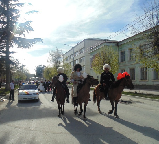 Первое воскресенье мая. В городе тихо и солнечно, после нескольких дождливых дней. А неделю назад еще гремели свадьбы. В одной принял участие и я, со своими лошадками! Жених попросил организовать конный эскорт, ну или кортеж, кому как нравится. Я сильно переживал - никогда еще ни в чем подобном не участвовал. Но все прошло хорошо, без эксцессов. Наездники облачились в черкески и папахи, кони были приведены в порядок. Посадили жениха в длиннющий лимузин и поехали за невестой!