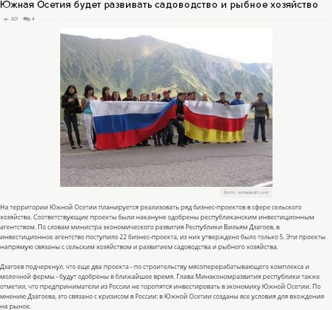 Еще один момент в этой заметке, несколько смущает, мягко говоря. Это заявление минэконома, о том, что "предприниматели из России не торопятся инвестировать в экономику Южной Осетии", и что это «связано с кризисом в России».