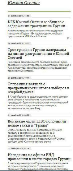 Однако просматривая ленту новостей из Южной Осетии, одного из информационных агентств, я почувствовал некую ущербность. Не будь 3-х заплутавших грузинских крестьян а потом еще одного, наверно искавшего первых трех, то о нас, кроме того, что в Грузии напали на офисы партии Саакашвили а в Азербайджане на выборах все голоса уже заранее распределены, писать то и нечего. Хотя насколько это "о нас", можно только догадываться, ну или домысливать, за поставивших эти ссылки в строку «Южная Осетия». Хорошо, что есть ЮВО, который получил новые танки и "Грады", а части ЮВО есть в РЮО.