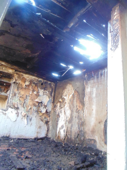 Вот сгоревший дом, он посередине без крыши. а по обе стороны крыши спасенных домов
