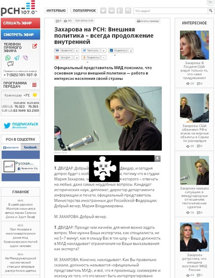 Многие в восторге от нового "лица" МИД РФ Марии Захаровой. Прочитав ее интервью на Русоновостях (http://rusnovosti.ru/posts/404594), мне показалось что Мария Владимировна заработалась и уже не отличает встречу с госдепом США от беседы с согражданами.
