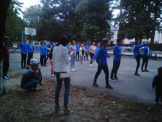 Народ старательно с энтузиазмом и задором повторял за ведущим порой довольно сложные движения. Царила атмосфера здорового веселья! Акция удалась.