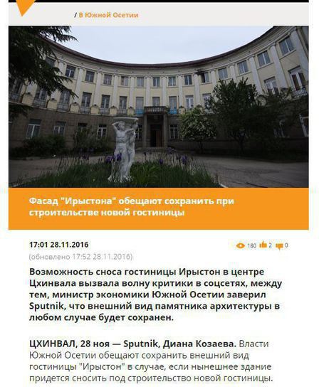 Не прошло и суток, а решение, о котором был написано в моём вчерашнем блоге было отменено. Речь шла о решение снести здание гостиницы Ирыстон, являющейся значимой частью исторического центра и его архитектурного ансамбля. Вот она - могущественная сила свободного слова! В Фэйсбуке была развернута дискуссия по этому вопросу, и в результате властям пришлось оправдываться и обещать не трогать фасада Ирыстона. Спасибо Фарнафазу, Палу Тадтаеву давшим ссылки на мою статью, и всем кто поддержал нас.