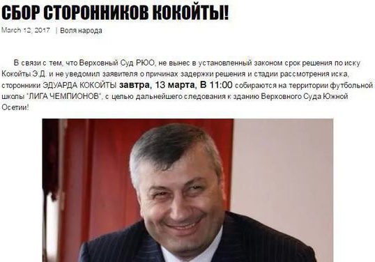 Но не будем проводит драматичные параллели. Я о другом. Ведь Эдуард Джабеевич то обещал не выходить на митинги. Я, например не поддерживал его в этих обещания, потому как митинги, надо проводить, если другие законные (!) средства не работают, и ни один политик не застрахован от ситуации, когда вынужден пойти на массовый протест. Но раз обещал, то уж выполняй, тем более, если идешь в президенты. А тут то отказывается, то призывает. Или может это не Кокойты призывает? Или может, не обещал? Или может не на протестный митинг, тут призывают, а так проследовать да прогуляться по старому Цхинвалу, да по над речкой Лиахвой, мимо Большого Парка, а там и Суд. Никакого митинга - чисто погулять.