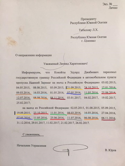 В соцсетях появились два документа, на основаниях которых, якобы было принято решение о несоответствии Кокойты цензу. Один от нашего КГБ - о пересечении поста Верхний Рук, а другой, о пересечениях поста Нижний Зарамаг.