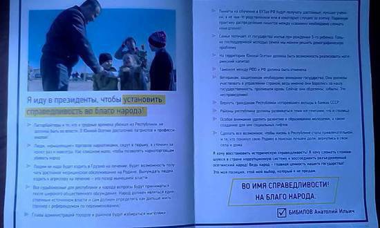 У Алана Гаглоева это был листок с биографией и с фотографией. Ни какой программной информации, даже лозунга нет. Ненавязчиво так. Типа сами решайте.