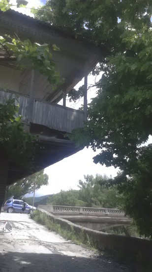 А это подъем от «мехзавода». Тут, бетон пост модернизма, органично сочетается с деревом старых городских построек и горбатым мостом через Леуахи.