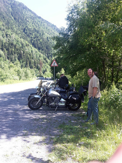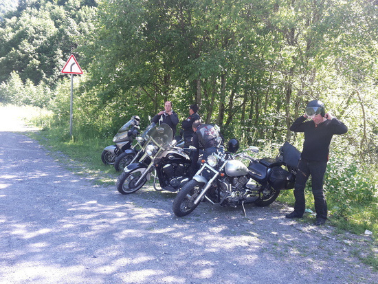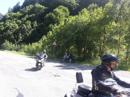 У придорожного кафе близ источника Багиатае встретил ,байкеров-рокеров. Они пообедали и уже готовились отчалить. Да, по моему их индианы и кавасаки и харлеи имено так делают, когда трогаются с места. Попросил их разрешения по-фотографировать. Ребята в кожанках согласились.