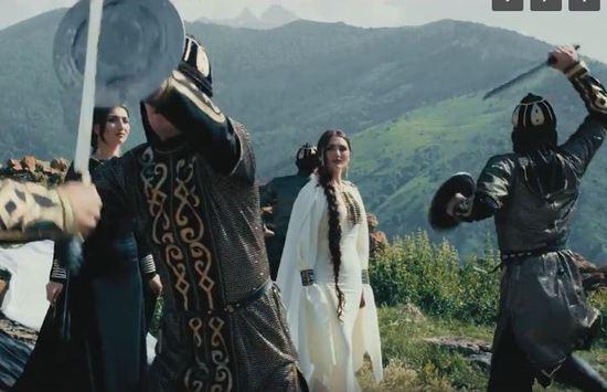 Конечно, надо дать звание сестрам Царикаевым. Ну, наградить, во всяком случае, надо. Хорошо поют, прекрасно при этом исполняют роль аланок-ясынок-осетинок. Где надо, гордо смотрят в даль, проходя сквозь строй бьющихся на мечах воинов, или стоя над обрывом. Где надо, скромно улыбаются, например при словах, что сына назовут Аланом. Движений тоже в меру, и они хорошо поставлены, жесты отточены и символичны.