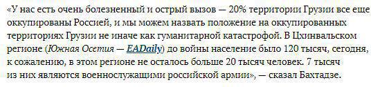 Да и сама фраза про население Южной Осетии, свидетельствует что Южной Осетии а соответсвтено осетин как национальности даже как сообщества, в Грузии, в Грузии, видеть не хотят. Цхинвалорегионцы - вот такая национальность их больше утстраивает. Бахтадзе говорит "до войны" но не уточняет до какой. Их было три по крайней мере, а на конференции о цифрах, надо соблюдать нумерацию.