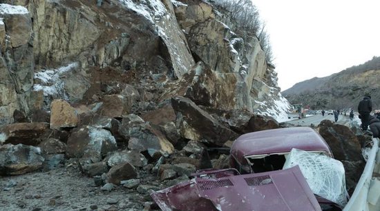 Не только снег и лавины, но и скалы и камни преграждают нам путь не только в Северную Осетию - Россию, но и из Цхинвала в Дзау попасть не дают. В пятницу, в районе трассы Цхинвал-Дзау, которую и в народе и исторически называют Чъехы Нараег - Чехская Теснина, осыпалась на дорогу целая скала, под которую попал автомобиль, водитель которого, просто чудом остался жив.