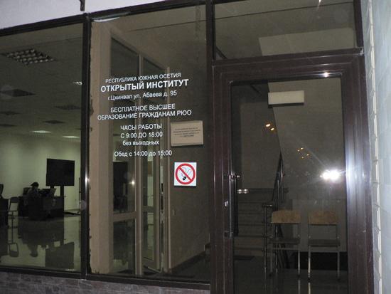 Решил зайти, узнать, что за заведение, блог потом написать. На дверях читаю "Открытый институт Республики Южная Осетия", "Ого - думаю - появился у нас и такой!". Открываю дверь. Но к сожалению открытость Института на этом закончилось. Рассказ о моих намерениях, я почему то смутил девушек-сотрудниц. Они сразу стали звонить ректору, который, то ли не ответил, то ли сказал своим сотрудникам, что б те не разрешали мне снимать Институт. Про сам Институт сотрудницы мне конечно рассказали, но к сожалению в общих чертах, без цифр и деталей. Я вышел, сфотографировал Открытый Институт снаружи, и ушел.