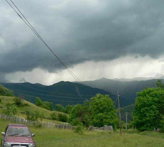 Уже стало как бы принятым, удивляться погоде. И вот я тоже не буду отставать от тренда. Я с детства в этих местах, в селе Кроз Джавского района, и такое явление, конечно, имело место быть, но в это начало лета - особенно часто. Дождь накрывает не всё Джавское ущелье, как раньше, а полосами, по частям, сначала например левые боковые ужелья Борджнис и Мзиугом, потом идет направо в Чимас, ну и так далее. И звоня друг другу, теперь местные жители не с «подколом» спрашивают, а на самом деле интересуются - "А у вас тоже дождь?". И еще шутят, что и люди, и природа с ума по-сходили, теперь и дождь на град похож стал - идет местами.