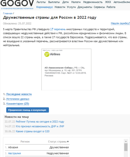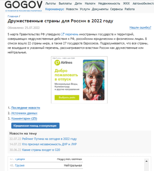 .И,о ужас! И там Грузии нет среди враждебных России. Видно нынче все рассматривается сквозь спецоперационную призму.И тогда Грузия уже и не выглядит врагом. И Россию можно в этом ракурсе понять Но я как журналист склонный к расследованию, пошел дальше, Оказывается глава МИД Лавров как то заявил что Россия считает дружественными все страны, не попавшие в список недружественных, Значит и Грузия дружественная. Но успокоил меня сайт .https://gogov.ru/articles/friendly-countries, где Грузия отмечена, все таки, как нейтральная.