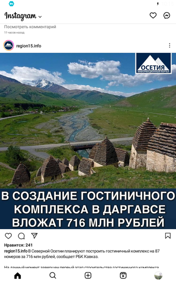 В аннотации, как о преимуществе отеля, сказано еще и то, что гостиничный комплекс площадью более 11 тыс. кв.м. будет расположен в уникальном природном месте Северной Осетии на высоте около 1500 м в непосредственной близости к памятнику, внесенному в список объектов Юнеско – Городу Мертвых, а также Даргавской долине с ее архитектурными памятниками и Мидаграбинским водопадом.