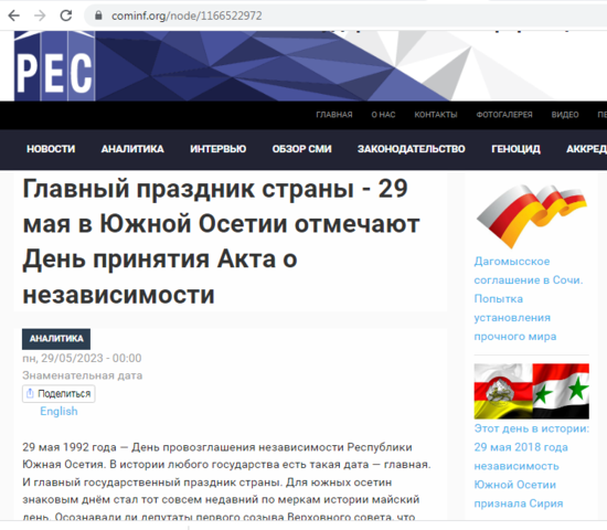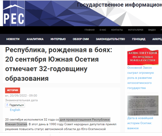 На самом деле, 20 сентября - День провозглашения Республики Южная Осетия. Тогда, в 1990 году, Совет народных депутатов Юго-Осетинской автономной области провозгласил Юго-Осетинскую Советскую демократическую республику (ЮОСДР). Наши СМИ правда добавляют что «в составе СССР». Но будучи в составе ГССР, мы и так были в составе СССР, который на тот момент еще не распадался.