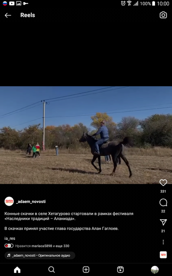 В эту Субботу, не скажу что схлестнулся, но слегка подискутировал на страницах одного "тиктокообразного" ресурса. Там была информация о том, что в селе Хетагурово (Цъунар) Цхинвальского района Южной Осетии стартовал республиканский фестиваль «Наследники традиций – Аланиада», и что будут скачки. В следующем абзаце сообщается, что президент Гаглоев проехался на коне. И сопровождают это кадры как «президент Гаглоев проехался на коне».
