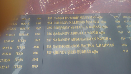 На постаменте гранитные плиты с именами погибших и потерявшихся без вести сельчан. Всего 239 имен. Среди них мои ближайшие родственники - Гаджиевы.