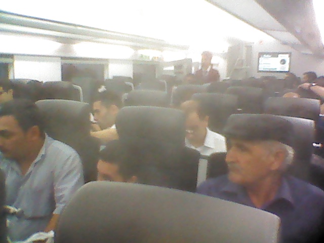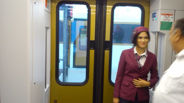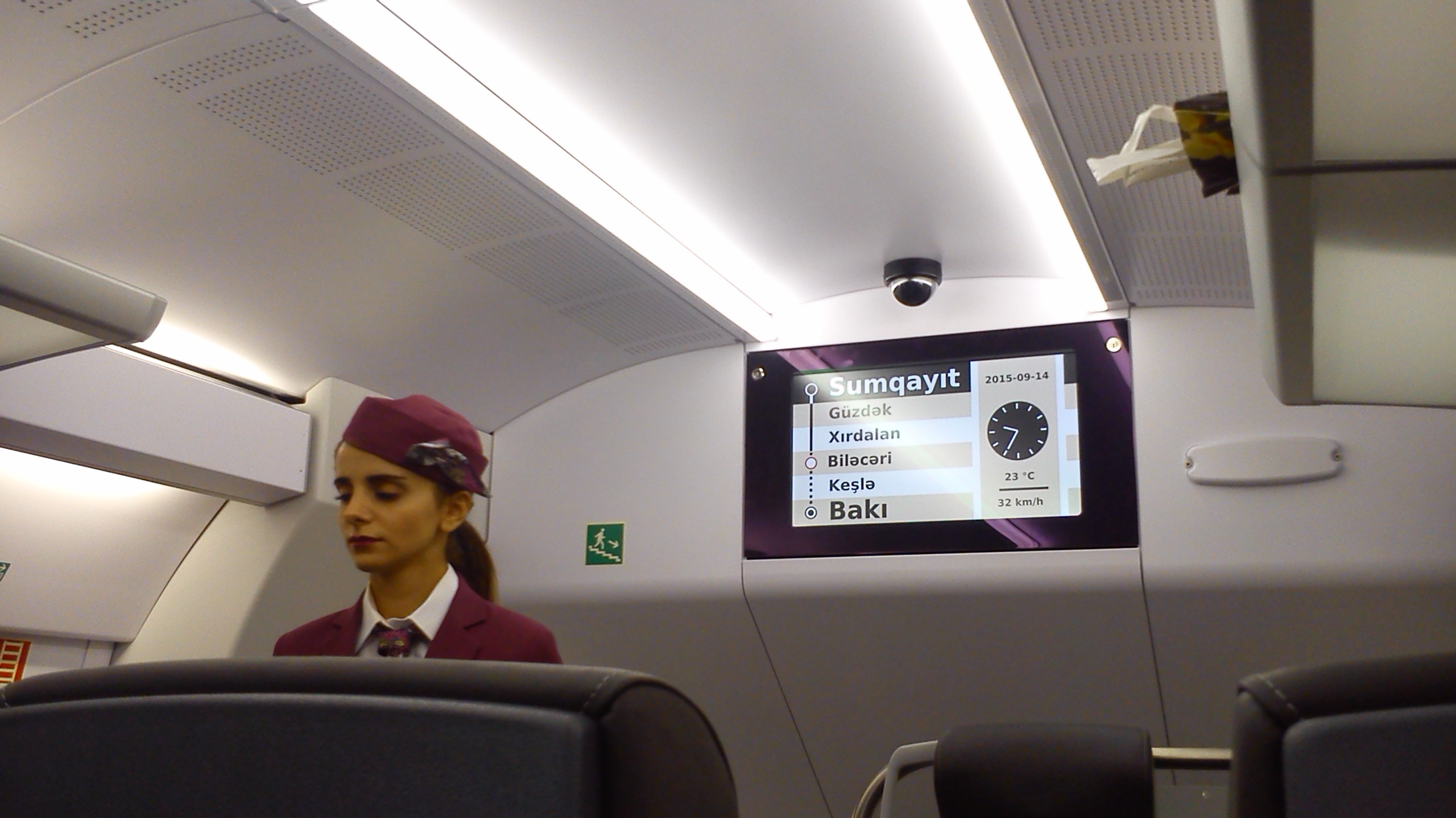 Дальше будет про скоростной поезд. Пока он движется медленно, так как график движения еще не определен точно, по бокам от путей нет ограждений. На пути в Сумгайыт, а двигался он туда 1 час 5 минут, поезд однажды разогнался до 86 км в час, что видно по табло над дверями. В основном скорость 59 км в час. Туда я ехал на первом этаже вагона, обратно - пересел на второй этаж.