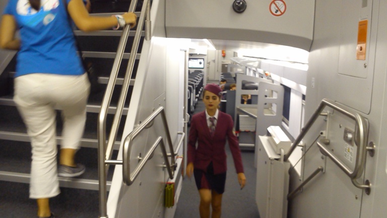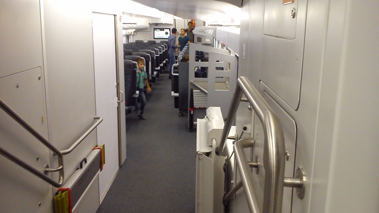 На переднем плане по бокам прохода установлены механизмы для перемещения пассажиров в колясках
