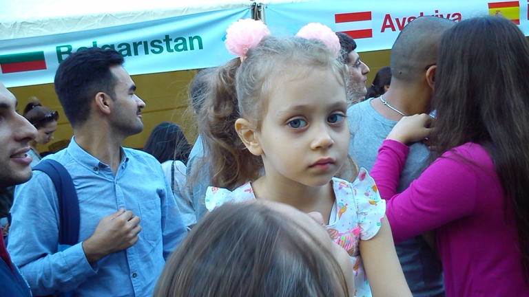 До начала концерта в крепости разбили свои палатки многие страны Евросоюза, раздавая в Евродеревне посетителям туристические буклеты и нанося им на щеки фломастерами флаги своих стран. Так с разноцветными щеками народ на концерт и повалил. Внизу вы видите немку в германской палатке