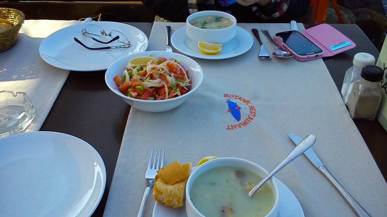 Проголодавшись на морском воздухе, выбираем один из многих прибрежных ресторанов. Везде подается рыба в разном виде - очень вкусно и дешево. Выбираем уху. Просто прелесть - кушать свежую рыбу, подкидывая кусочки сидящей рядом на камне чайке, и смотреть на спокойное Мраморное море. Ай да Путин - надо же, какое удовольствие запретил своему народу. Это от сильной любви к россиянам, не меньше!