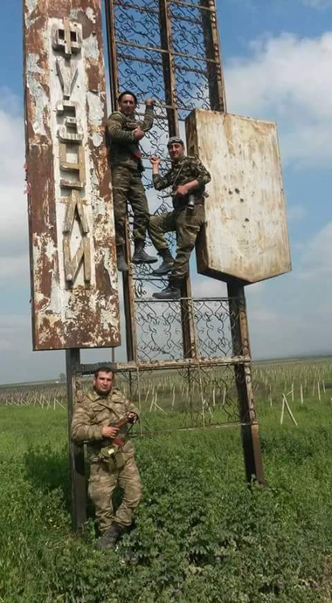 Азербайджанские солдаты фотографируются у советских указателей, свидетельствующих о принадлежности этих земель советскому Азербайджану