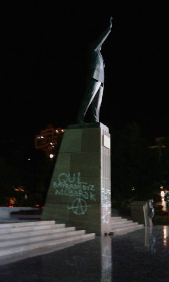 Позавчера в Баку были ошарашены выставленными в фейсбуке фото памятника Г.Алиева в центре Баку, с намалеванными на постаменте надписями. Как? Кто мог такое сделать если в центре города всегда ходят патрули, видеокамеры, освещение, гуляют люди - денно и нощно?
