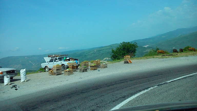 Дорога через Габалу хорошая, едешь покачиваясь на пружинах, с музыкой Pink Floyd запавшей после того поста. Национальные FM- радиоканалы слушать невозможно и опасно, можно разнервничаться от очередного всплеска бездарности ведущего и врезаться в дерево. Другой рукой пытался фотографировать, тоже занятие нелегкое, другим не советую. Все-таки жизнь дороже.