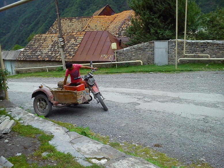 Посмотрите на лицо этого парня. Думаете, индус, фотография из Индии? Нет, я встретил его сегодня в Илису, он азербайджанец в смысле гражданин и житель Азербайджана, а по происхождению индус. Эту общину, живущую в селе Гейнюк (вторая буква - е с двумя точками сверху), у нас называют цыганами (гарачи), они сами величают себя то цыганами, то курдами, или езидами. По-моему, сами не знают кто они, так как образовательский ценз у них не очень. Я с детства наблюдаю их, они появляются в районном центре - городе Гах, часто женщины попрошайничают на рынке, а мужчиныразъезжают по селам скупая цветной металл, ездят на раздолбанных "Жигулях" или вот этот на старом мотоцикле "Урал". Еще они собирают лесные ягоды на продажу, просят милостыню в Баку и других городах.