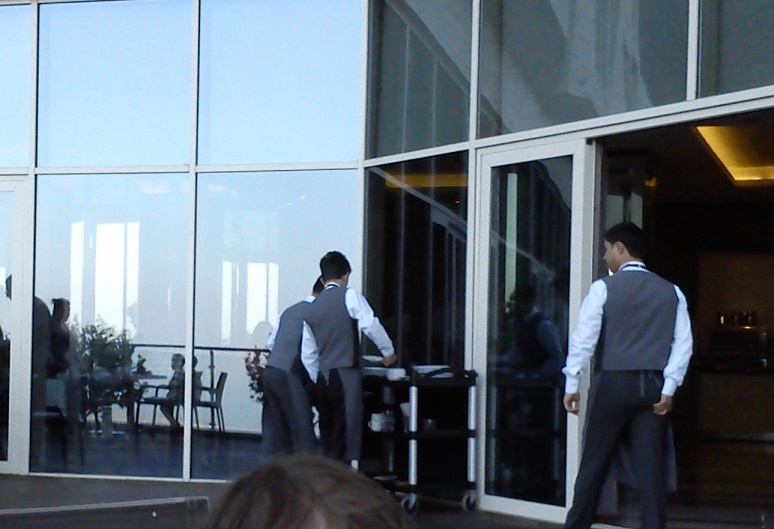 Официанты вышколенные, их много, чтобы всем туристам услуг хватило. Наняты в соседних селах, получают 218 манат в месяц летом, нерегулярно, а в холодные времена года уходят в отпуск за свой счет и призываются на работу при появлении туристов - обычно это бывает в праздники.