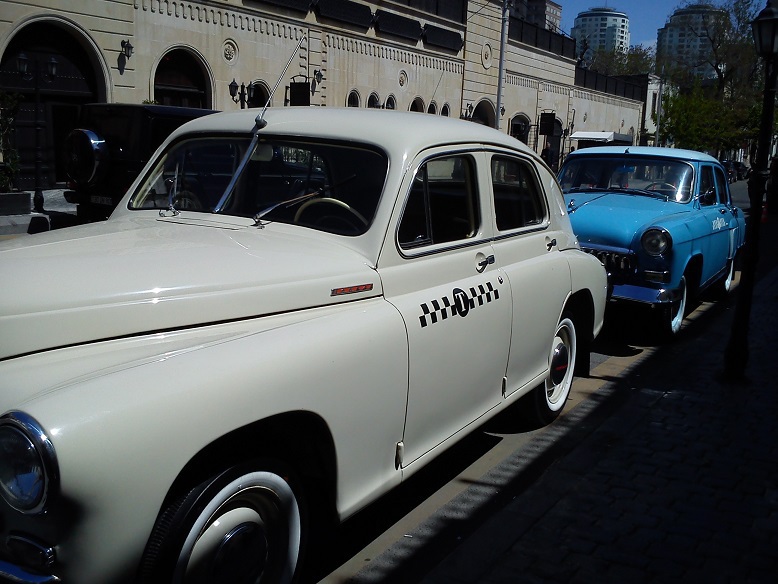 Вчера прошел по старым, грязным улочкам к Тезе Базару (по улочкам на которой большевисткая типография "Нина" была на заре красной революции, в подвале, там потом революционный музей был - помните?) и вдруг появился на совсем другой, обновленной, красивой улочке с рестораном-музеем (так было написано) и у входа стояли два этих такси. Думаю, эти отреставрированные "Волга" и "Победа" как такси не используются, а только экспонаты про старое советское Баку.