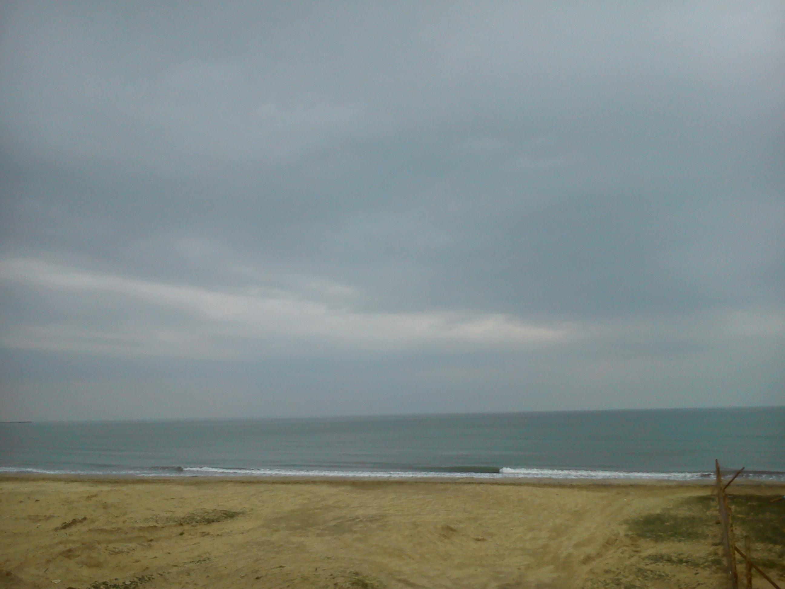 Сегодня был в Сумгайыте и проехал к морю. На берегу никого, только мокрый песок и пролетают по шоссе автомобили. Патрульный полицейский кубик на колесах притормозил, посмотрел как я фотографирую воду и молча удалился.